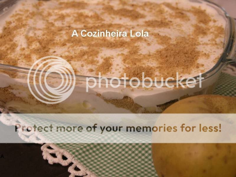 Num pirex colocar em camadas sucessivas de puré de maçã, doce de leite, natas e bolacha ralada.